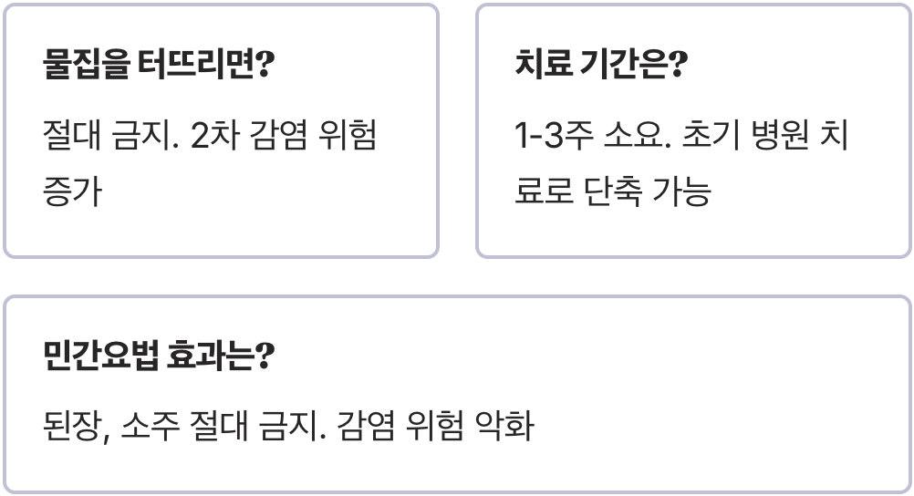 A. 절대 아닙니다. 물집을 인위적으로 터뜨리면 손상된 피부를 통해 세균이 침투하여 2차 감염의 위험이 매우 커집니다. 또한, 물집 속의 진물은 알레르기 반응의 결과물일 뿐, 옻독 성분은 없어 다른 부위로 번지게 하지는 않습니다. 자연스럽게 흡수되거나 가라앉도록 두는 것이 가장 좋습니다.
