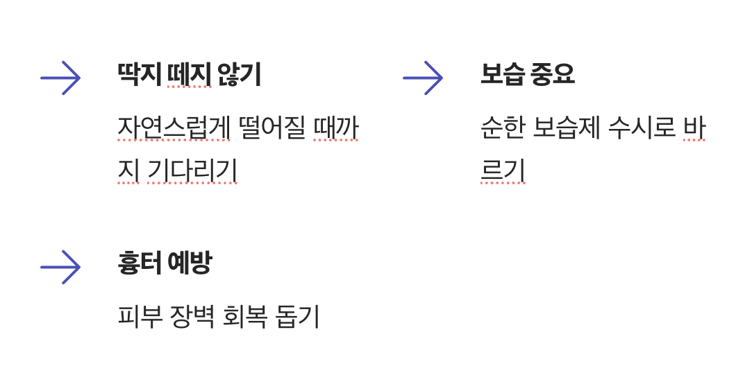 피부가 건조해지면서 다시 가려움이 느껴질 수 있는데, 이 시기에는 보습이 무엇보다 중요합니다. 자극이 없는 순한 보습제를 수시로 발라 피부 장벽이 건강하게 회복될 수 있도록 도와주세요. 이는 건조함으로 인한 가려움을 줄여주고, 새살이 부드럽게 돋아나도록 돕는 가장 확실한 방법입니다.