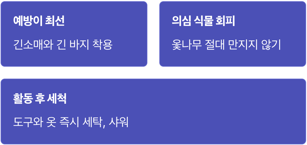 야외 활동 후에는 사용했던 도구나 입었던 옷을 즉시 분리하여 세탁하고, 샤워를 통해 몸에 남아있을지 모를 원인 물질을 깨끗이 씻어내는 것을 생활화하세요. 이러한 작은 습관들이 당신을 끔찍한 고통으로부터 지켜줄 수 있습니다.