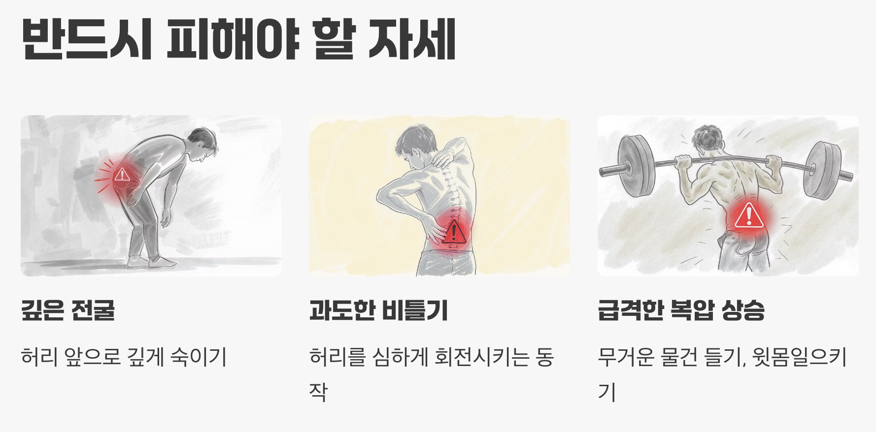 A. 네, 있습니다. 첫째, 허리를 앞으로 깊게 숙이는 자세. 둘째, 허리를 과도하게 비트는 자세. 셋째, 무거운 것을 들거나 윗몸 일으키기처럼 복압을 급격하게 높이는 동작. 이 세 가지는 디스크에 가해지는 압력을 높여 증상을 악화시킬 수 있으므로 반드시 피해야 합니다.