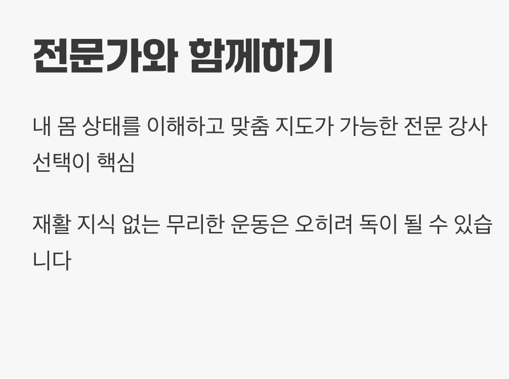 하지만 이 모든 것보다 더 중요한 것이 있습니다. 바로 내 몸 상태를 정확히 이해하고, 나에게 맞는 운동과 피해야 할 동작을 명확히 알려줄 수 있는 ‘전문적인 강사’와 함께하는 것입니다. 재활 지식을 갖춘 전문가의 지도 없는 무리한 운동은 오히려 독이 될 수 있다는 사실을 반드시 기억해야 합니다.