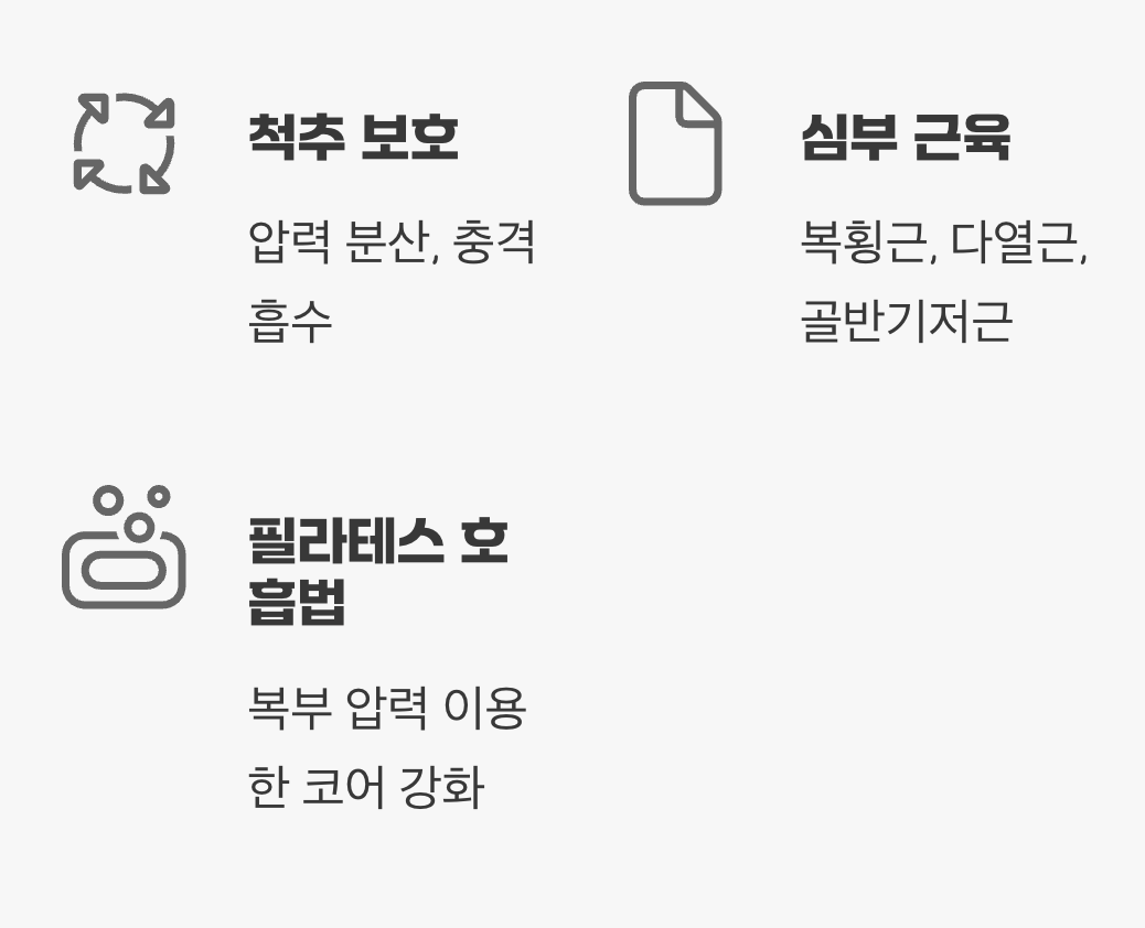 허리 디스크 재활의 핵심은 무엇일까요? 바로 우리 몸의 ‘천연 복대’라 불리는 코어 근육을 강화하는 것입니다. 복횡근, 다열근, 골반기저근 등 척추를 감싸고 있는 이 심부 근육들이 튼튼해져야, 척추에 가해지는 압력을 분산시키고 일상생활에서의 충격을 흡수하여 디스크를 보호할 수 있습니다.