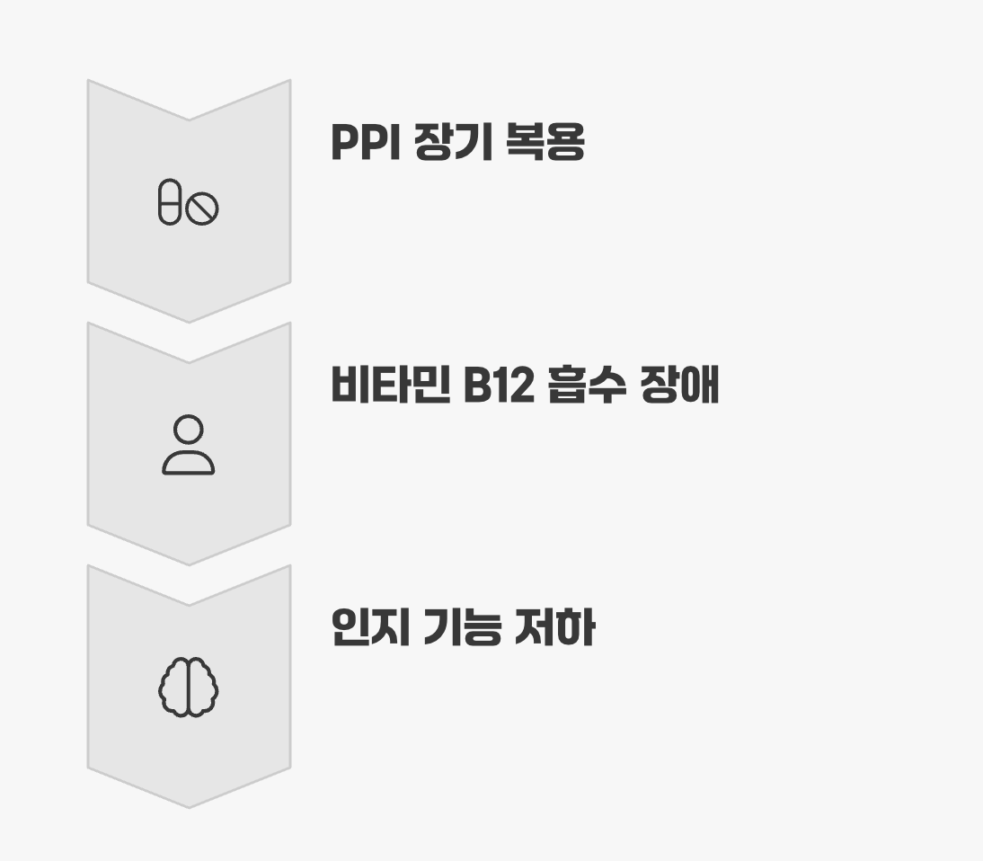 비타민 B12는 뇌 기능과 신경계를 건강하게 유지하는 데 필수적인 영양소인데, 음식물 속 단백질과 결합된 비타민 B12를 분리하여 흡수하는 과정에 바로 위산이 결정적인 역할을 합니다. 위산 분비가 장기간 억제되면 비타민 B12 결핍을 초래하고, 이는 인지 기능 저하나 신경 손상, 나아가 치매의 위험을 높일 수 있다는 것입니다.