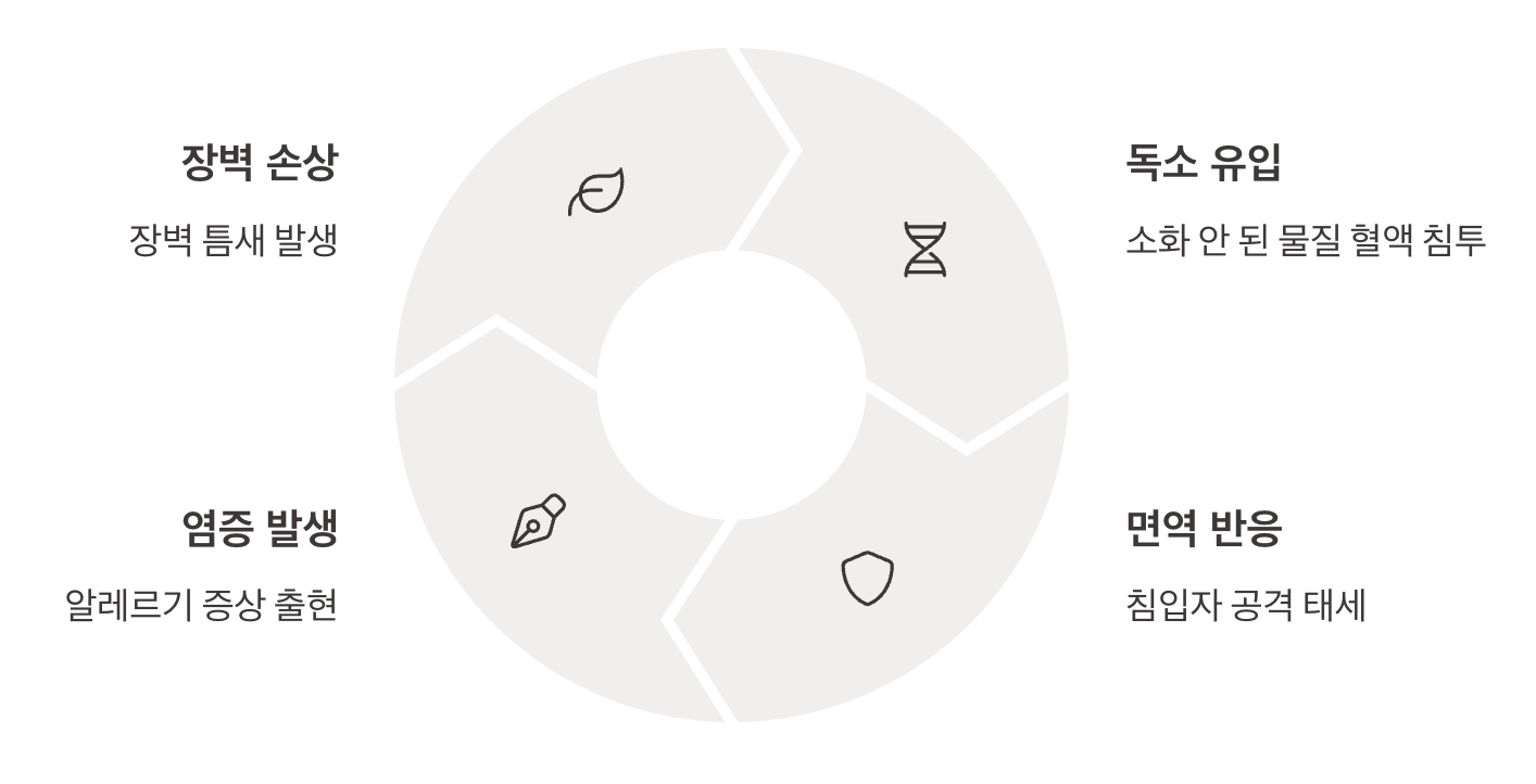 하지만 여러 가지 이유로 이 촘촘했던 장 점막이 손상되고 느슨해지면, 체의 구멍이 커진 것처럼 틈이 벌어지게 됩니다. 바로 이 틈으로 원래는 걸러졌어야 할 독소, 세균, 소화 덜 된 음식물 분자들이 혈관 속으로 ‘새어 들어가는’ 현상을 장 누수 증후군이라고 부릅니다.