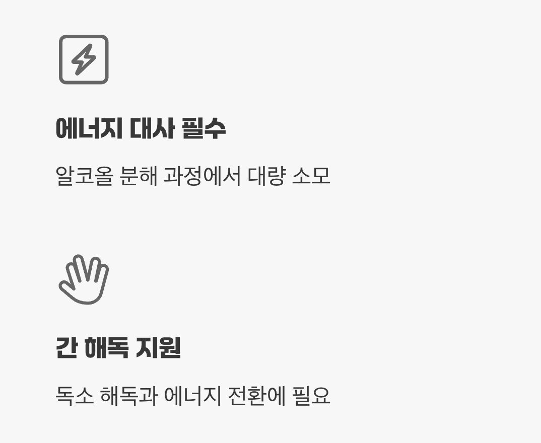특히 간이 알코올이라는 독소를 해독하고, 섭취한 음식을 에너지로 전환하는 모든 과정에 비타민 B군이 반드시 필요합니다. 따라서 충분한 비타민 B군을 보충해 주는 것은, 지친 에너지 공장의 가동을 돕고 만성적인 피로감을 개선하는 데 매우 효과적인 방법입니다. 아침에 활력을 불어넣고 싶다면, 고함량 활성 비타민 B군을 챙겨보세요.