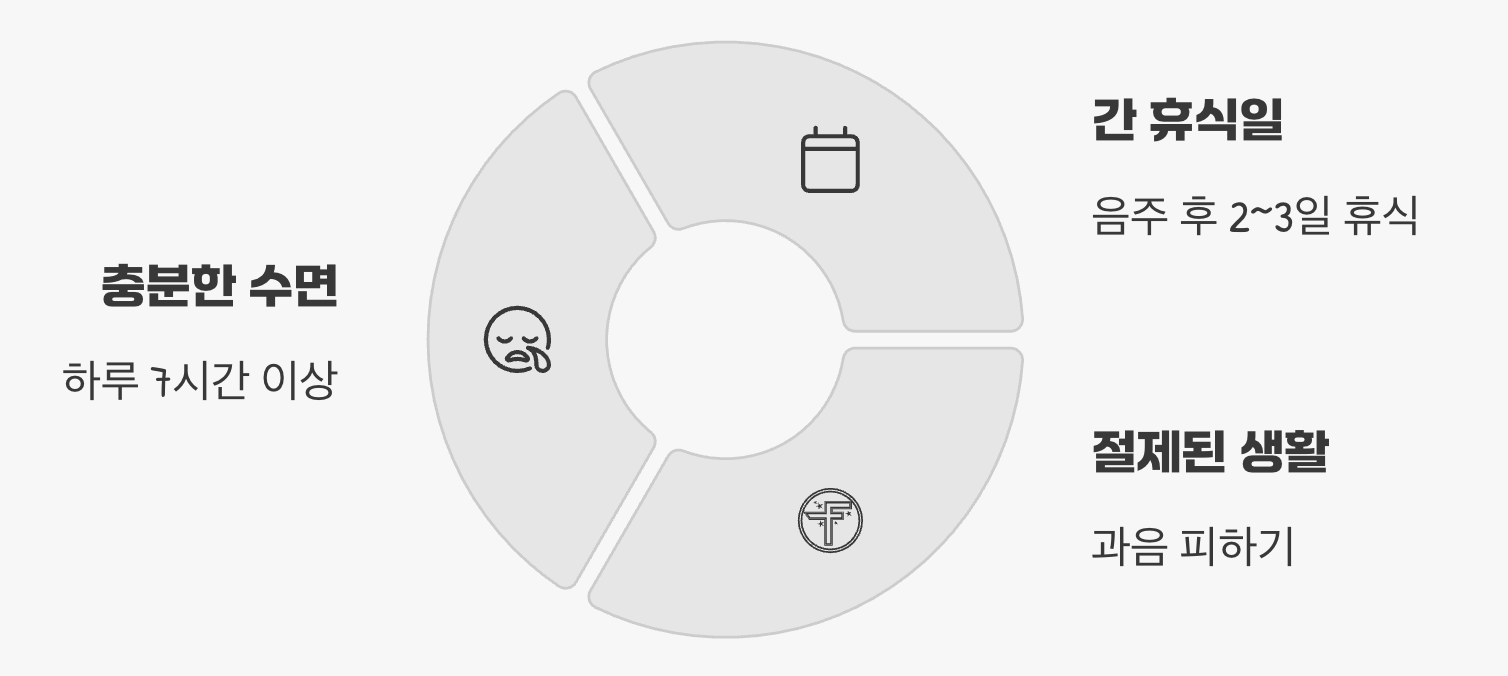 간을 지키는 최고의 명약은 바로 ‘충분한 휴식’과 ‘절제’입니다. 간이 스스로 회복할 수 있는 시간을 주는 것이 무엇보다 중요합니다. 술자리는 가급적 피하고, 마시게 되더라도 최소한 2~3일의 ‘간 휴식일’을 가지는 것이 좋습니다. 또한, 잠자는 동안 간의 해독 작용이 가장 활발하게 일어나므로, 하루 7시간 이상의 충분한 수면을 확보하려는 노력이 반드시 필요합니다.