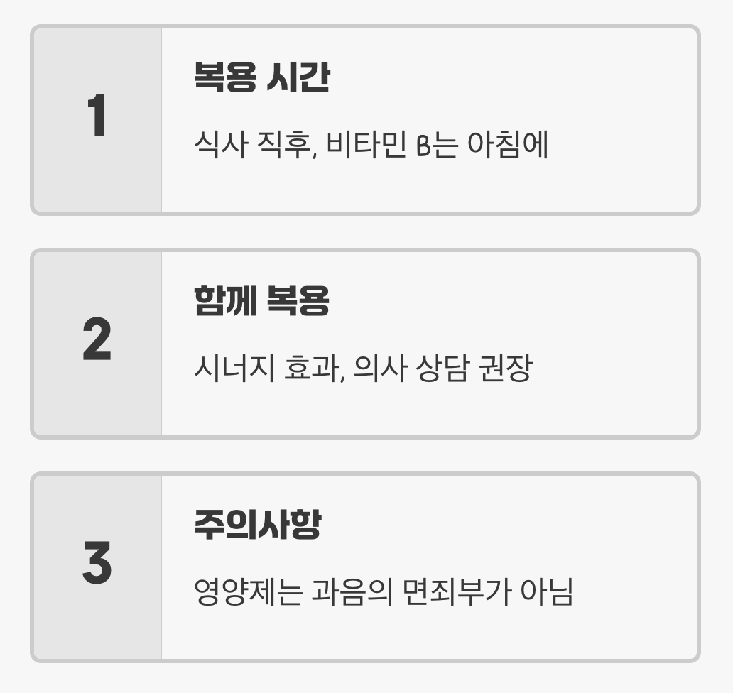 A. 대부분의 간 영양제는 식사 직후에 드시는 것이 위장 부담을 줄이고 흡수율을 높이는 데 도움이 됩니다. 특히, 에너지 대사를 돕는 비타민 B군은 아침 식사 후에 섭취하면 하루 종일 활력을 유지하는 데 더 효과적일 수 있습니다.
