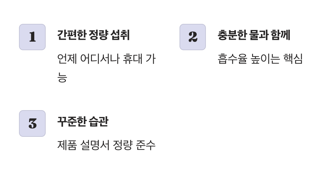 환으로 섭취할 때 기억해야 할 가장 중요한 점은, 반드시 ‘충분한 양의 물’과 함께 삼켜야 한다는 것입니다. 물을 충분히 마셔주어야 환이 위장에서 잘 풀어져 우리 몸에 효과적으로 흡수될 수 있습니다. 제품 설명서에 나와 있는 정량을 지켜 꾸준히 섭취하는 습관을 들이는 것이 중요합니다.