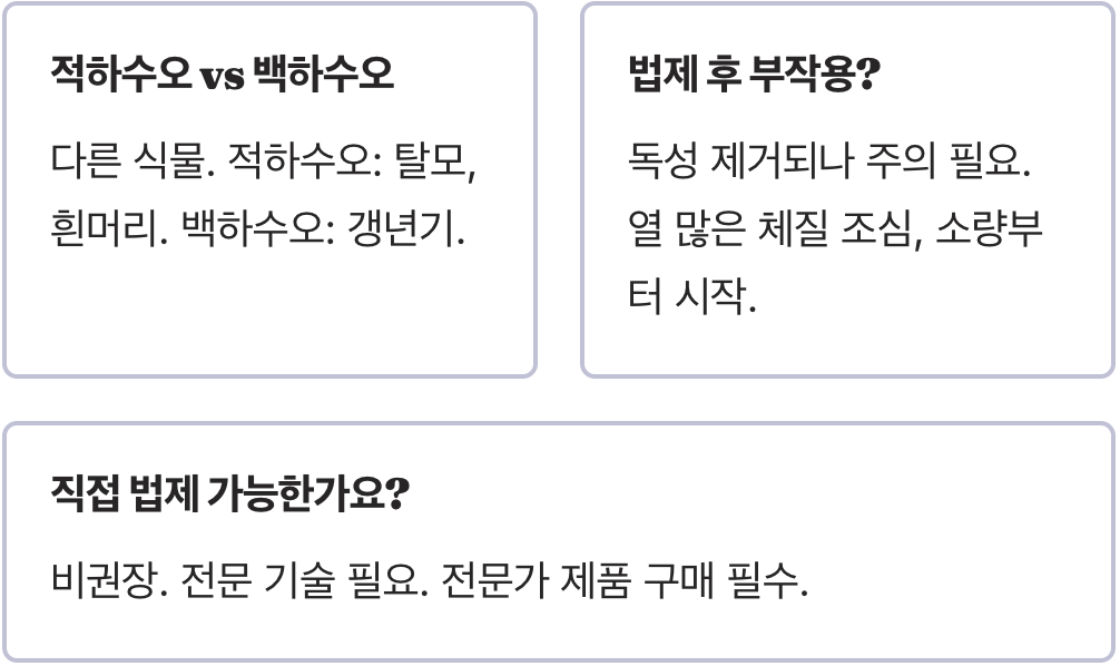 A. 이름이 비슷해 많은 분들이 혼동하지만, 둘은 과(科)부터 다른 완전히 별개의 식물입니다. 우리가 흔히 탈모와 흰머리에 좋다고 말하는 것은 마디풀과의 ‘적하수오’이며, 박주가리과의 ‘백하수오(백수오)’는 주로 여성 갱년기 건강에 도움을 주는 것으로 알려져 있습니다. 반드시 효능과 목적에 맞게 구분해서 사용해야 합니다.