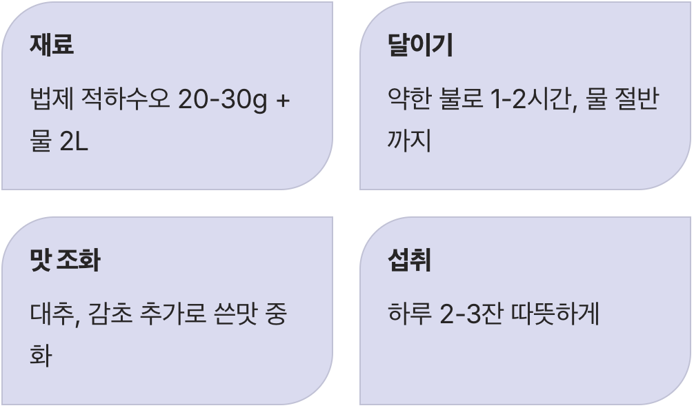 이때, 대추나 감초를 몇 조각 함께 넣고 달이면 쓴맛은 중화되고 약재의 기운은 더욱 조화로워집니다. 이렇게 완성된 차는 냉장 보관해두고 하루 2~3잔씩 따뜻하게 데워 마시면, 몸의 근본을 채워주는 든든한 건강차가 되어줄 것입니다.
