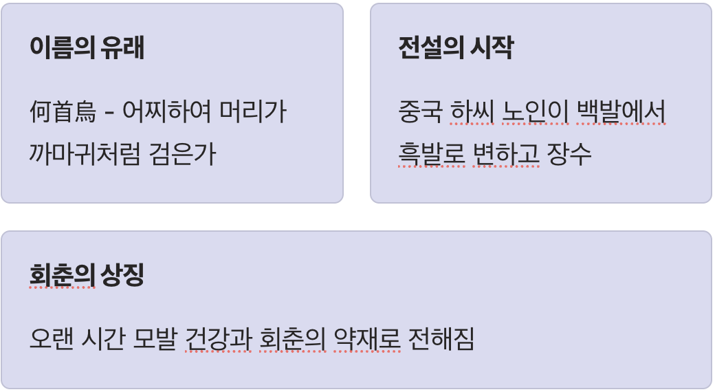 이 이야기는 단순히 뜬구름 잡는 전설이 아니라, 아주 오랜 시간 동안 사람들이 이 약초를 왜 ‘회춘’과 ‘모발 건강’의 상징으로 여겨왔는지를 명확하게 보여줍니다. 이처럼 어떤 약재의 효능을 이해할 때 그 이름에 얽힌 유래를 먼저 살펴보는 것은, 그 본질을 파악하는 아주 좋은 해결책이 됩니다.