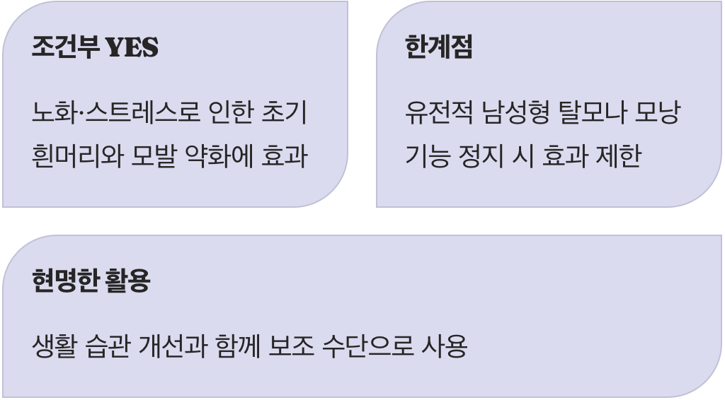 하지만 이것이 모든 종류의 탈모에 효과가 있는 만병통치약은 결코 아닙니다. 유전적인 요인이 큰 남성형 탈모나, 이미 모낭의 기능이 완전히 멈춘 경우에는 큰 효과를 기대하기 어렵습니다. 적하수오에만 의존하기보다는, 균형 잡힌 식단과 충분한 수면, 스트레스 관리와 같은 전반적인 생활 습관 개선과 함께 보조적인 수단으로 활용하는 것이 가장 현명한 해결책이 될 것입니다.
