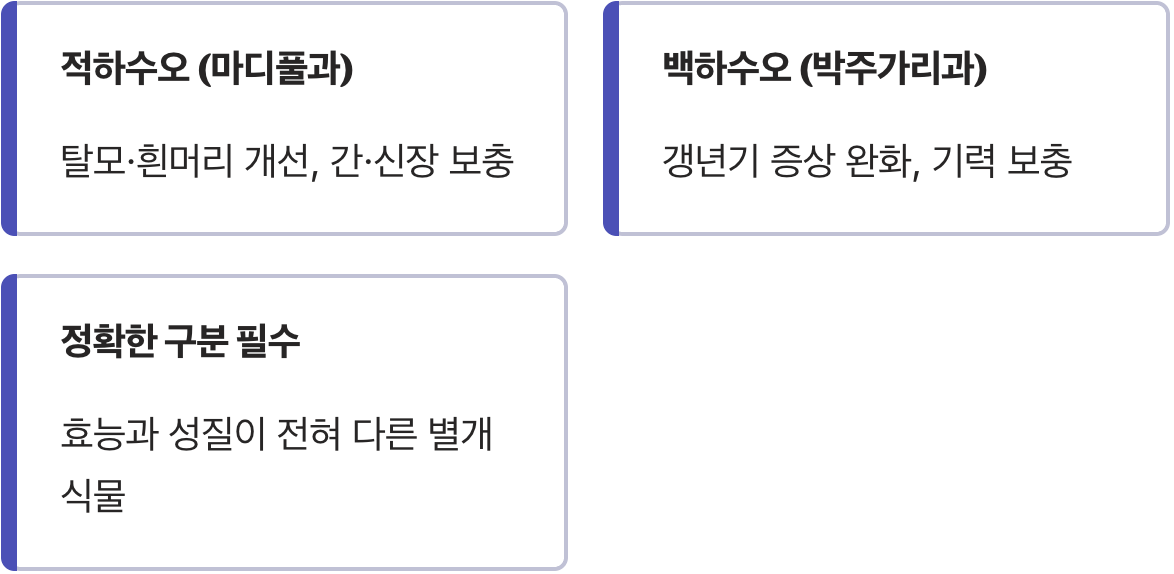 반면, 박주가리과에 속하는 백하수오(백수오)는 주로 여성 갱년기 증상 완화나 기력 보충에 도움을 주는 것으로 알려져 있습니다. 효능과 성질이 전혀 다르기 때문에, 자신의 목적에 맞는 것을 정확하게 알고 구분해서 섭취하는 것이 매우 중요합니다. 혼동하지 않고 올바르게 구별하는 것, 이것이 바로 똑똑한 건강 관리의 시작입니다.