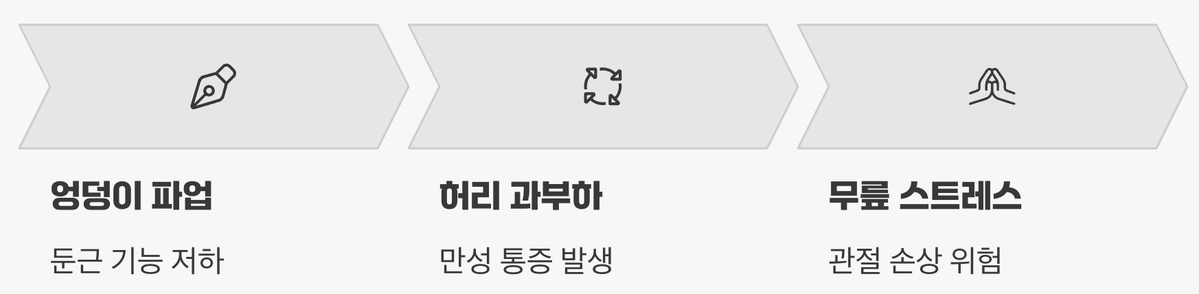 엉덩이 근육이 약해져 햄스트링 등 다른 근육이 과도하게 사용되고, 근육 불균형과 통증이 생길 수 있습니다.