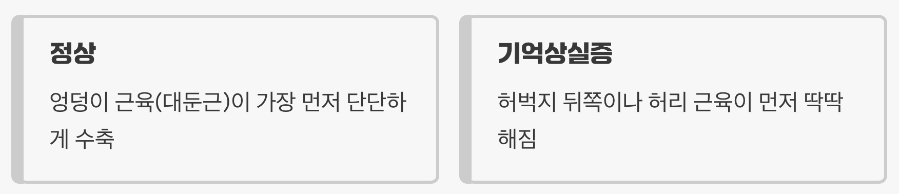손대지 않고 일어서기, 누워서 엉덩이 들고 버티기 등 간단한 테스트로 엉덩이 근육 기능 저하 여부를 확인할 수 있습니다. 5회 일어서기에 16초 이상 걸리면 위험 신호입니다. - 힘없는 엉덩이… '엉덩이 기억상실증' 예방법은? - 브런치