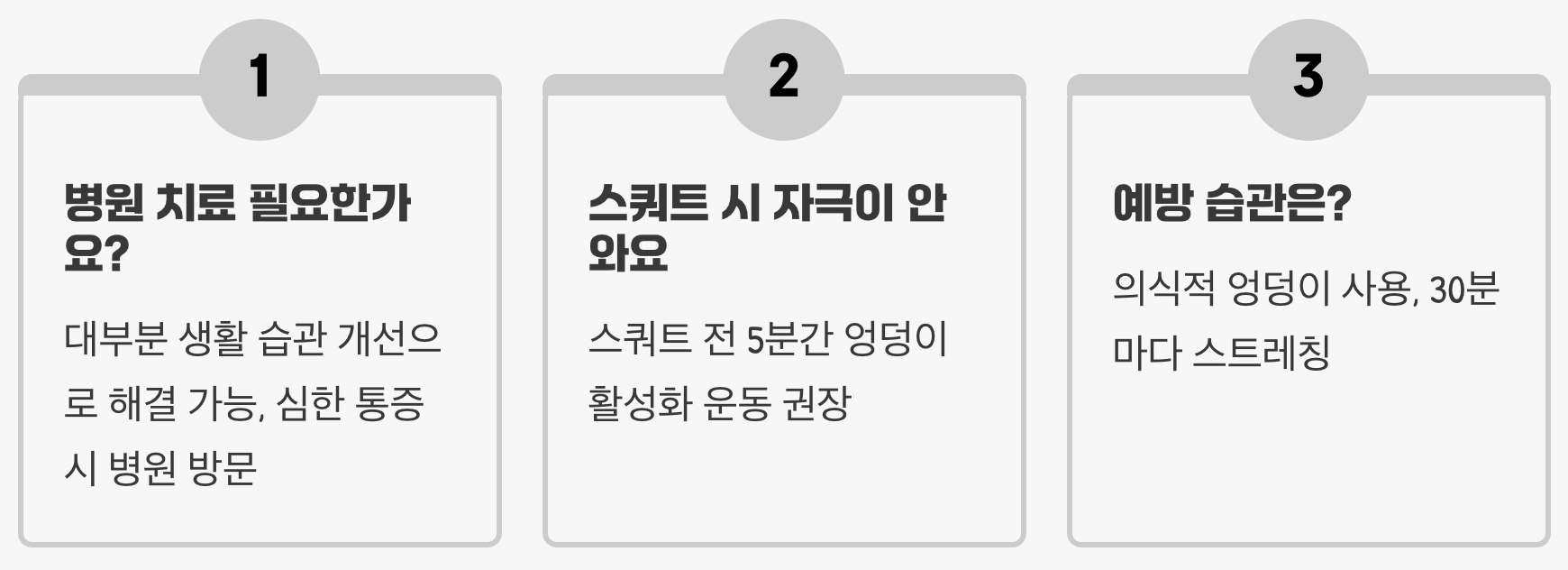 A. 대부분의 경우 질병이라기보다는, 잘못된 생활 습관으로 인한 ‘기능 저하’ 상태입니다. 따라서 꾸준한 스트레칭과 오늘 알려드린 브릿지 같은 둔근 활성화 운동만으로도 충분히 개선될 수 있습니다. 하지만 허리나 고관절에 심한 통증이 동반된다면, 병원을 방문하여 정확한 진단을 받아보는 것이 좋습니다.