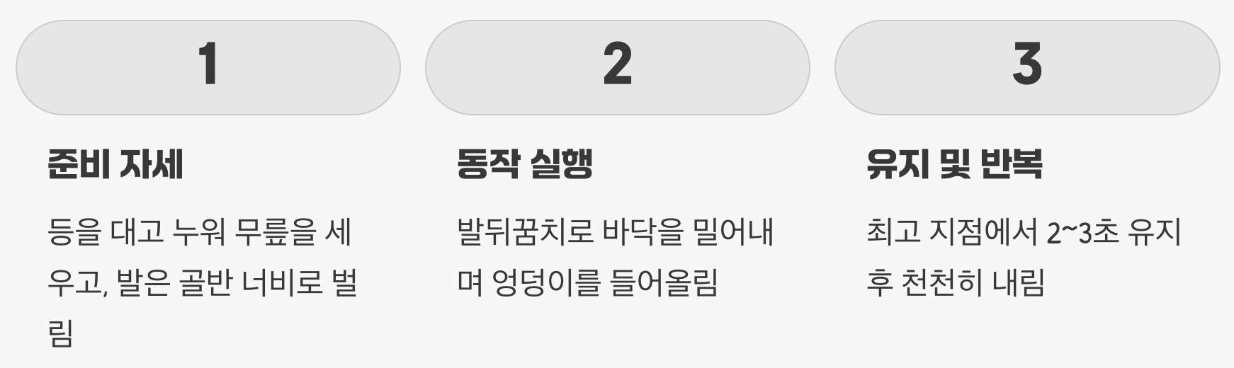 바닥에 등을 대고 누워 무릎을 세우고, 발은 골반 너비로 벌립니다. 그 상태에서 발뒤꿈치로 바닥을 밀어낸다는 느낌으로, 엉덩이를 천천히 들어 올립니다. 이때 허리가 너무 꺾이지 않도록 주의하고, 엉덩이 근육이 꽉 조여지는 것을 느끼는 것이 핵심입니다. 최고 지점에서 2~3초간 멈춘 뒤, 천천히 내려오는 동작을 반복해 주세요.