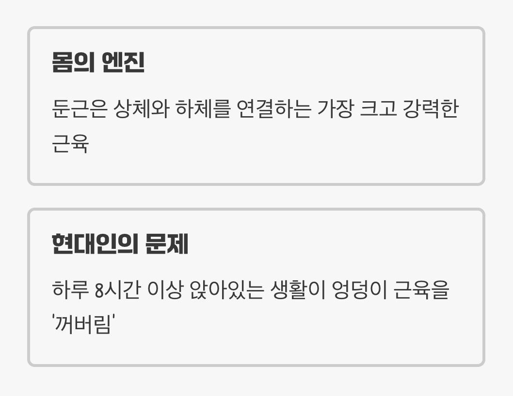 하지만 하루 8시간 이상 의자에 앉아있는 현대인의 생활 습관은, 이 중요한 엔진을 꺼버리는 스위치와 같습니다. 오랜 시간 의자에 눌려있으면 엉덩이 근육으로 가는 신경 신호가 약해지고, 근육은 점점 더 약해집니다. 결국 엉덩이는 자신이 힘을 써야 한다는 사실조차 잊어버리는 ‘기억상실’ 상태에 빠지게 되는 것입니다.
