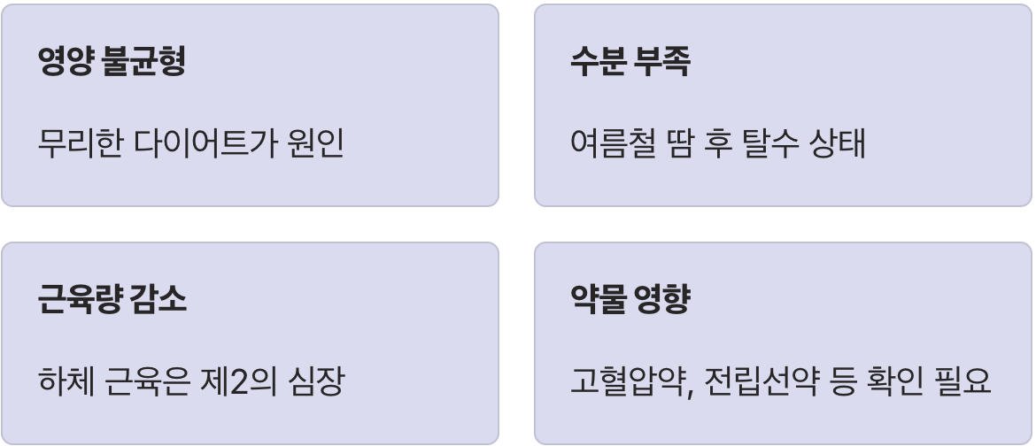 중년기에 접어들며 저혈압 증상이 나타났다면, 그 원인은 내 생활 습관 속에 숨어있을 가능성이 높습니다. 무리한 다이어트로 인한 영양 불균형, 여름철 땀을 많이 흘린 뒤의 수분 부족, 그리고 나이가 들면서 자연스럽게 줄어드는 ‘근육량 감소’가 대표적인 원인입니다.