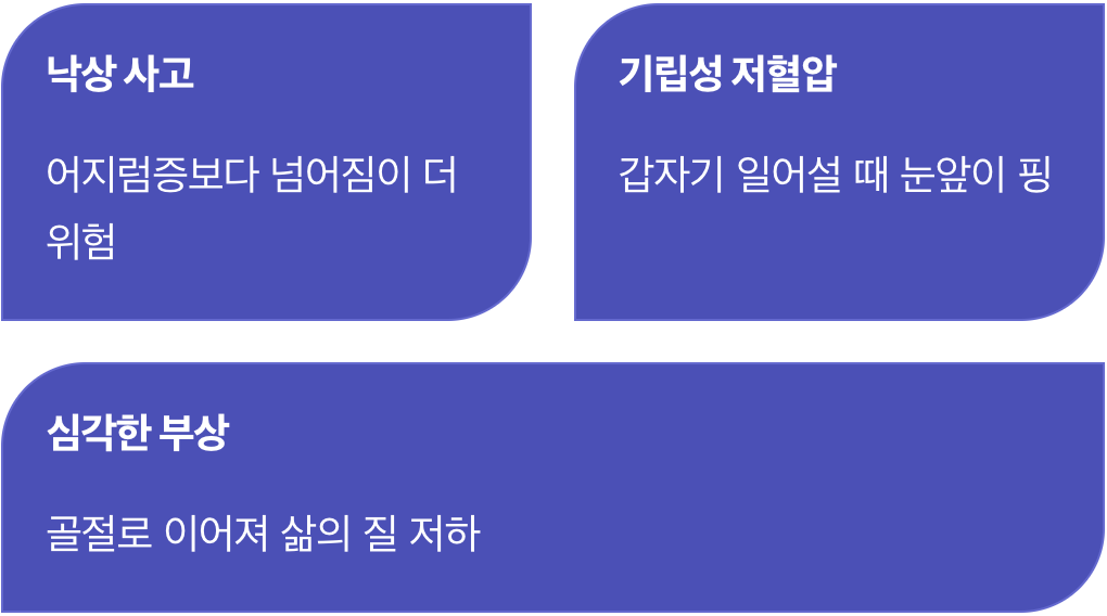 젊었을 때는 잠시 휘청하고 균형을 잡을 수 있었겠지만, 근력과 순발력이 예전 같지 않은 중년에게 순간적인 어지럼증은 속수무책으로 넘어지는 사고로 이어질 수 있습니다. 그리고 중년의 낙상은 단순한 타박상으로 끝나지 않고, 손목이나 고관절 골절과 같은 심각한 부상으로 이어져 삶의 질을 송두리째 흔들어 놓을 수 있습니다. 이처럼 어지럼증을 가볍게 여기지 않고 낙상을 예방하는 것이야말로, 건강한 노년을 위한 가장 중요한 해결책입니다.