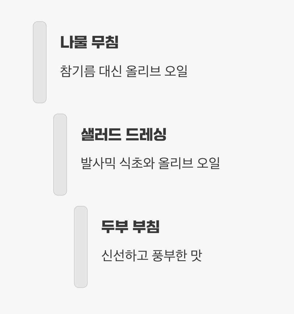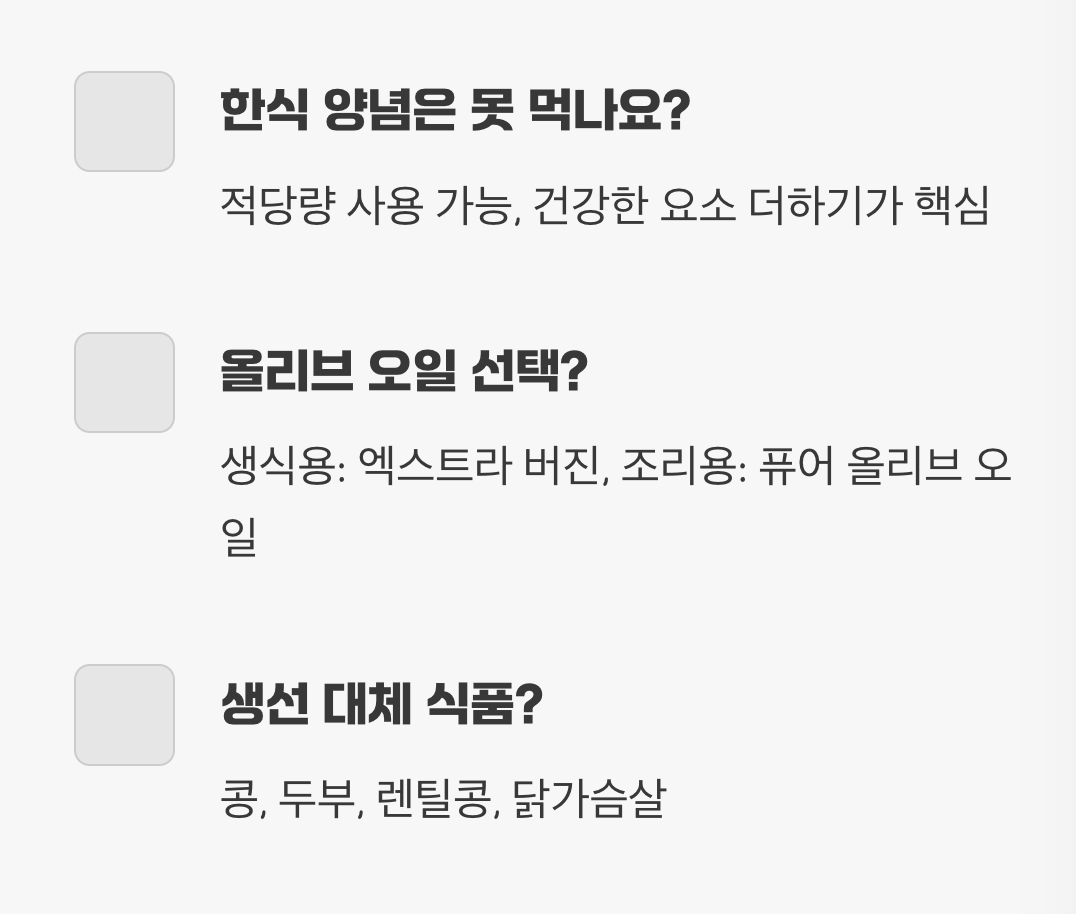 샐러드드레싱을 만들 때나, 두부 부침을 할 때도 마찬가지입니다. 발사믹 식초와 올리브 오일만 섞어도 훌륭한 드레싱이 완성되고, 참기름의 고소함과는 또 다른 신선하고 풍부한 맛의 세계를 경험할 수 있습니다. 매일의 식탁에 이 작은 습관 하나를 더하는 것만으로도, 당신은 이미 지중해식 식단을 실천하고 있는 셈입니다.