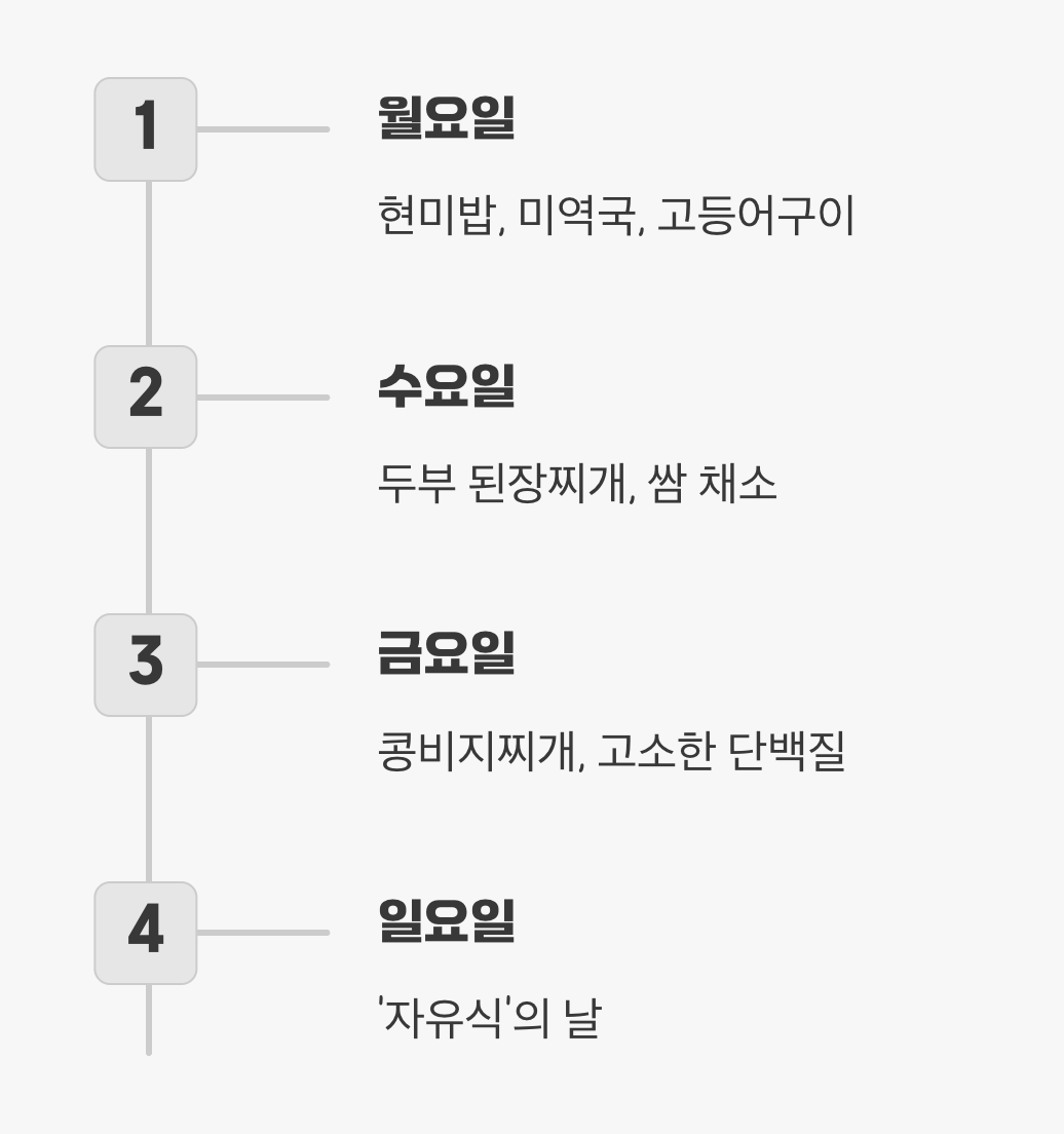 금요일에는 콩비지찌개로 고소한 단백질을 보충하고, 토요일 점심은 다양한 버섯을 넣은 들깨탕으로 건강함을 더합니다. 그리고 일요일에는 너무 스트레스받지 않도록, 먹고 싶었던 음식을 즐기는 ‘자유식’의 날로 정해보세요. 꾸준히 지속할 수 있는 식단이야말로 가장 좋은 식단이니까요.
