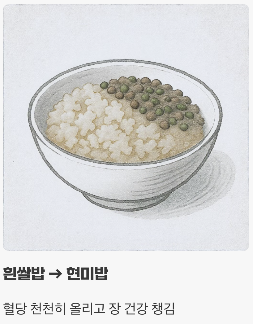 한국인의 밥상에서 빼놓을 수 없는 것이 바로 밥과 고기입니다. 이 두 가지만 살짝 바꿔주어도 우리 몸은 놀라운 변화를 경험하게 됩니다. 먼저, 매일 먹는 흰쌀밥에 현미나 귀리, 렌틸콩 같은 통곡물을 섞어보세요. 통곡물은 혈당을 천천히 올리고, 풍부한 식이섬유가 장 건강까지 챙겨줍니다.