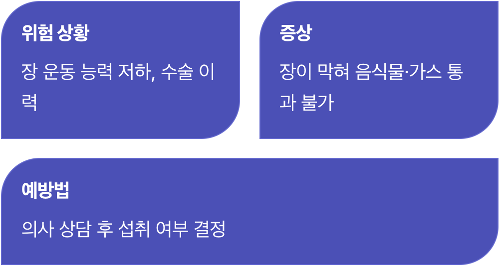아주 드물지만 심각한 경우에는 '장폐색'이 올 수도 있습니다. 장폐색은 장이 꽉 막혀서 음식물이나 가스가 통과하지 못하는 응급 상황을 말합니다. 평소에 장의 운동 능력이 현저히 떨어져 있거나, 과거에 장 수술을 받아 장 협착이 있는 분들이 가루를 뭉쳐서 드시거나 물 없이 드셨을 때 발생할 위험이 있습니다.