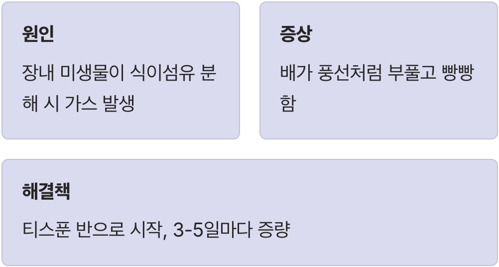 가장 흔하게 겪는 첫 번째 부작용은 바로 복부 팽만감입니다. 평소에 채소를 잘 안 먹다가 갑자기 고농축 식이섬유가 장 속으로 들어오면, 우리 장내 미생물들이 이것을 분해하는 과정에서 일시적으로 많은 양의 가스를 만들어냅니다. 마치 뱃속에서 풍선이 불어나는 것 같은 빵빵함 때문에 일상생활이 불편해질 수 있습니다.