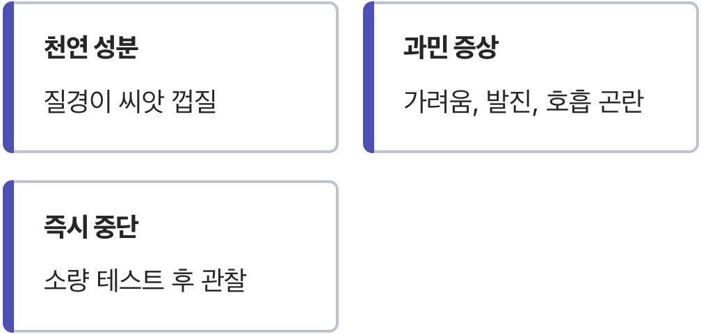 처음 드시는 분이라면 아주 소량만 섭취해 보고 몸의 변화를 면밀히 관찰하세요. 만약 섭취 후 눈이나 입술이 붓거나 몸이 가려운 느낌이 든다면 즉시 섭취를 중단하고 병원을 찾아야 합니다. "명현 현상이겠지" 하고 넘기지 말고 즉각적인 중단이 내 몸을 보호하는 가장 빠른 길입니다.