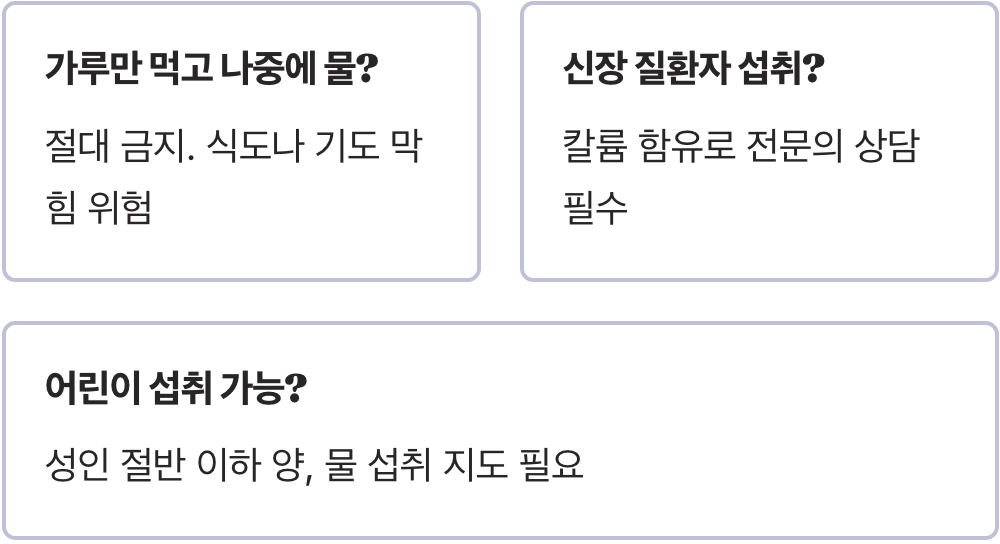 A. 절대 안 됩니다. 가루가 식도나 기도에 달라붙어 그 자리에서 부풀어 오르면 숨을 못 쉬게 하거나 식도를 막을 수 있는 매우 위험한 행동입니다. 반드시 컵에 물과 함께 타서 액체 상태로 섞은 뒤에 마셔야 안전하게 위장까지 도달할 수 있습니다.