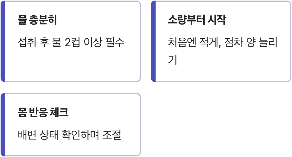 처음부터 너무 많은 양을 드시면 갑자기 늘어난 식이섬유 때문에 배에 가스가 차거나 복부 팽만감을 느낄 수 있습니다. 처음에는 소량으로 시작해서 몸의 반응을 살피며 조금씩 양을 늘려가는 것이 좋습니다. 내 몸에 맞는 적정량을 찾아 꾸준히 섭취하는 것이 장기적인 건강을 위한 올바른 해결책입니다.