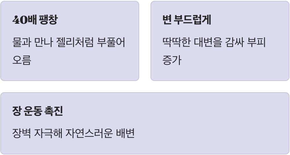 우리가 먹는 이 가루의 가장 큰 특징은 수분을 흡수하는 능력입니다. 가루 상태일 때는 아주 작지만, 물과 만나면 무려 40배나 팽창하여 젤리처럼 끈적하고 부드러운 덩어리로 변합니다. 이것이 장 속으로 들어가면 딱딱했던 대변을 부드럽게 감싸고 부피를 크게 만들어줍니다.