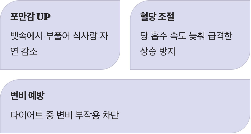 또한 탄수화물이 당으로 흡수되는 속도를 늦춰주어 혈당이 급격히 오르는 것을 막아줍니다. 다이어트 중 변비가 생기는 부작용도 막고, 식욕도 억제하고 싶다면 이만한 친구가 없습니다. 무작정 굶지 말고 이 식이섬유를 활용해 배부르면서도 건강한 다이어트를 성공으로 이끄시길 바랍니다.
