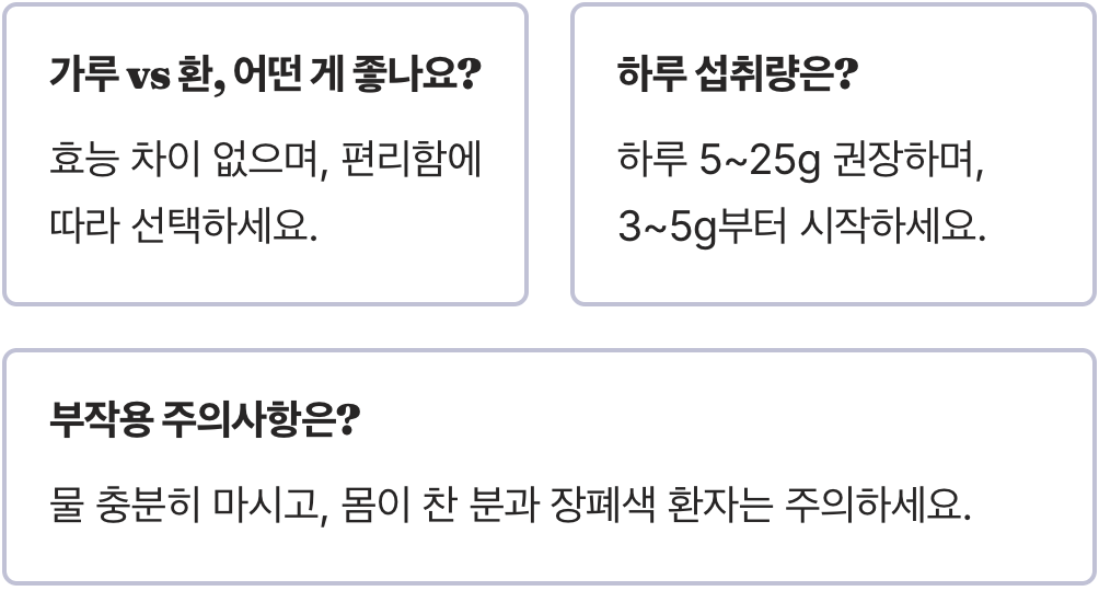 A. 형태에 따른 효능의 차이는 크게 없습니다. 다만 가루 형태는 입자가 작아 물을 더 빨리 흡수하므로 효과가 조금 더 빠르게 나타날 수 있지만, 특유의 맛이나 냄새가 거북할 수 있습니다. 반면 환이나 캡슐은 먹기가 편하고 휴대가 간편하다는 장점이 있습니다. 본인이 꾸준히 먹기 편한 형태를 선택하는 것이 가장 좋은 방법입니다.