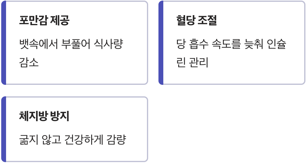 또한 탄수화물이 당으로 분해되어 흡수되는 속도를 늦춰주는 역할도 합니다. 이는 식사 후 혈당이 급격하게 치솟는 것을 막아주어, 인슐린 분비를 조절하고 체지방이 쌓이는 것을 방지합니다. 굶지 않고 건강하게 살을 빼고 싶은 분들에게 포만감과 혈당 관리라는 두 마리 토끼를 동시에 잡을 수 있는 최고의 다이어트 파트너가 되어줄 것입니다.