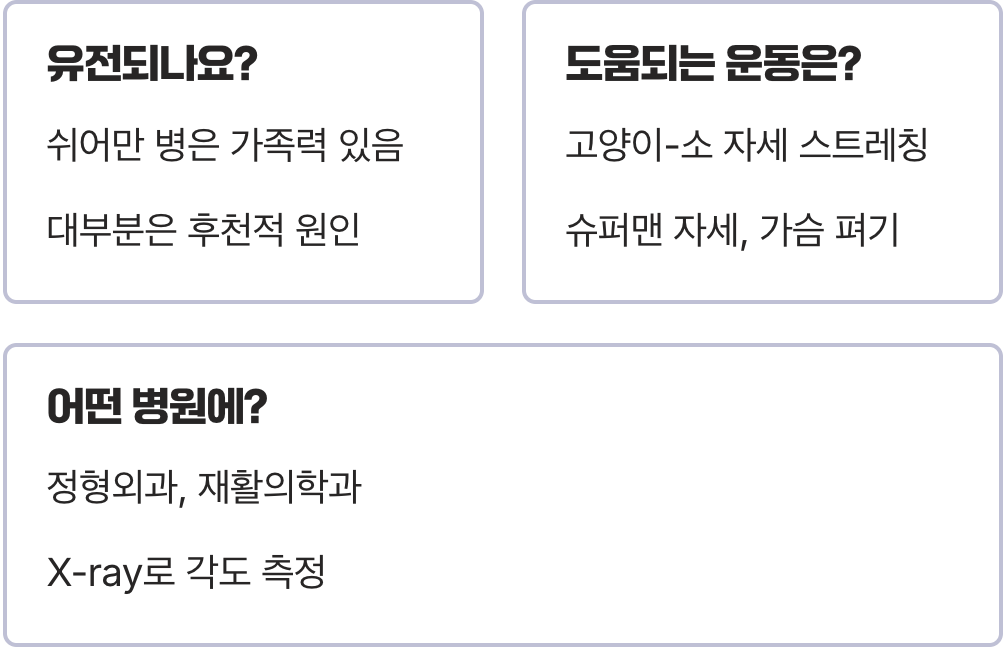 A. 굽은 등을 펴주고 척추 주변 근육을 강화하는 스트레칭과 근력 운동이 중요합니다. 대표적으로 ‘고양이-소 자세’ 스트레칭, 등 근육을 강화하는 ‘슈퍼맨 자세’, 그리고 가슴을 활짝 펴주는 운동들이 도움이 됩니다. 다만, 통증이 심할 경우 반드시 전문가와 상담 후 운동을 시작해야 합니다.
