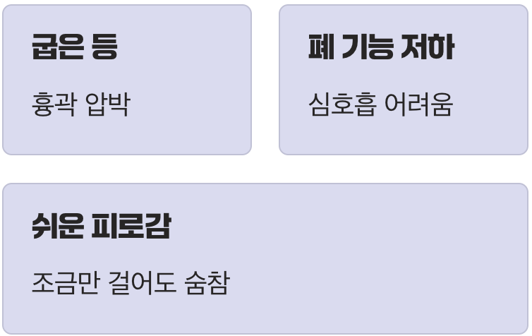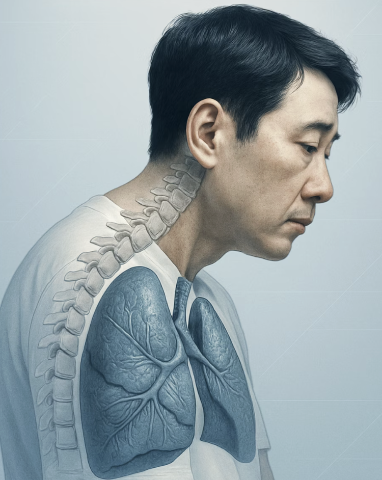등이 굽는 것은 단순히 미관상의 문제를 넘어, 우리 몸 내부의 장기에도 영향을 미칠 수 있습니다. 굽은 등은 가슴 우리(흉곽)를 압박하여 그 안에 있는 폐가 충분히 팽창하는 것을 방해합니다. 이로 인해 심호흡이 어려워지고, 조금만 걷거나 계단을 올라도 남들보다 쉽게 숨이 차는 증상이 나타날 수 있습니다.