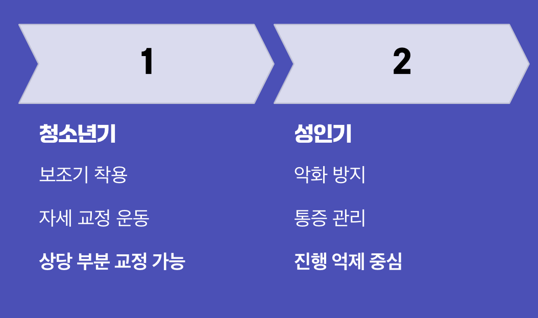 척추후만증은 초기에 발견할수록 치료 결과가 훨씬 좋습니다. 특히 척추 성장이 아직 끝나지 않은 청소년기에 발견하면, 보조기를 착용하거나 꾸준한 자세 교정 운동을 통해 변형의 진행을 막고 상당 부분 교정할 수 있는 ‘골든타임’이 존재합니다. 하지만 성장이 끝난 성인의 경우나, 노인성 골다공증으로 인해 척추가 약해진 경우에는 변형을 되돌리기보다 더 이상의 악화를 막고 통증을 관리하는 데 치료의 초점을 맞추게 됩니다.