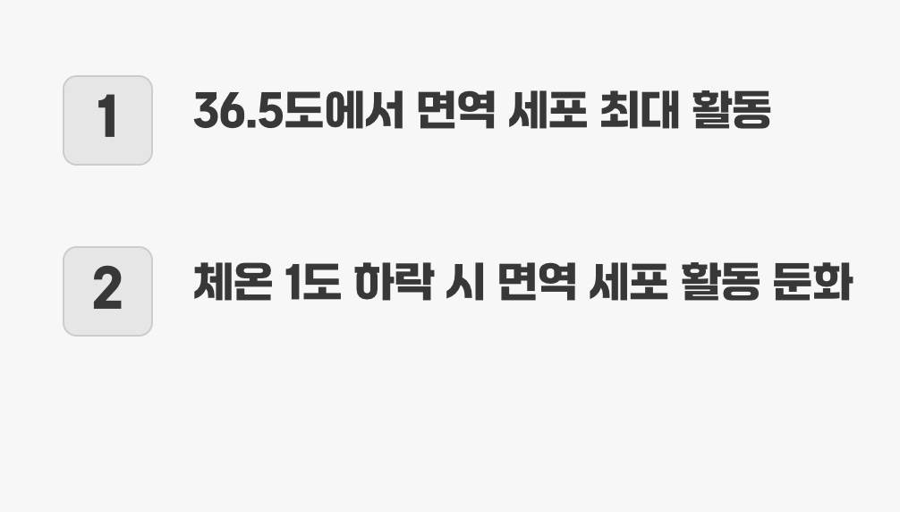 우리 몸의 면역 체계는 외부에서 침입한 바이러스나 세균과 싸우는 훌륭한 군대와도 같습니다. 그리고 이 군대의 전투력은 바로 ‘체온’에 의해 크게 좌우됩니다. 우리 몸의 정상 체온인 36.5도 근처에서, 면역 세포들은 가장 활발하게 움직이며 제 역할을 다합니다.