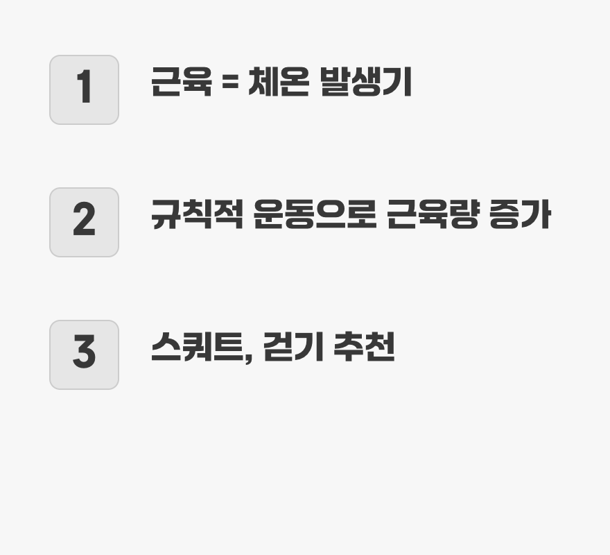 우리 몸에서 열을 만들어내는 가장 큰 ‘난로’는 바로 ‘근육’입니다. 근육은 우리가 움직일 때마다 수축하고 이완하며 끊임없이 열을 발생시킵니다. 따라서 근육량이 부족하면, 우리 몸은 스스로 열을 만들어내는 능력이 떨어져 쉽게 체온이 낮아지는 체질이 됩니다.