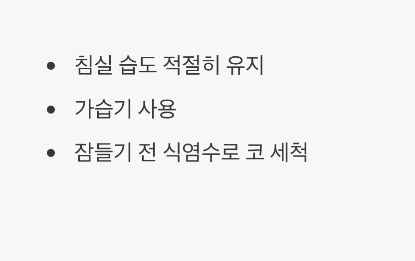 코막힘 역시 입으로 숨을 쉬게 만들어 코골이를 유발하는 흔한 원인 중 하나입니다. 평소 비염이 있거나 코가 자주 막힌다면, 콧속 공기의 흐름을 원활하게 만들어주는 노력이 필요합니다.