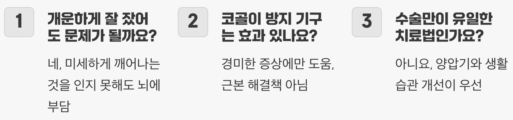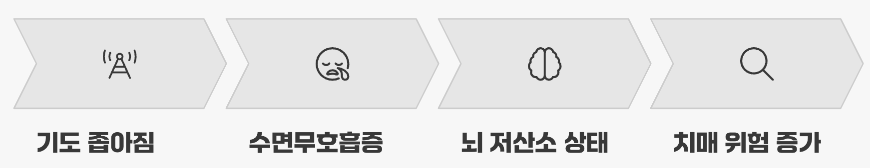코골이와 수면무호흡증을 방치하면 뇌로 가는 산소 공급이 줄어들어 뇌 손상과 인지 기능 저하, 치매 위험이 높아질 수 있으므로 반드시 생활습관 개선과 치료가 필요하다고 강조합니다. - 코골이 방치하면 치매 위험↑(?) - 복지뉴스