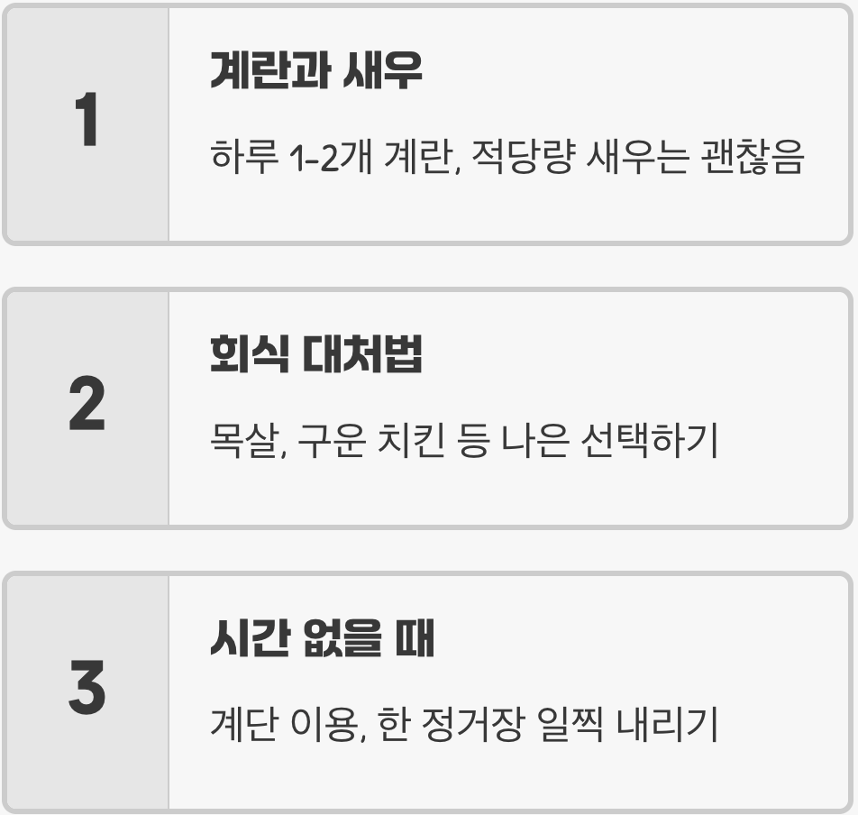A. 꼭 헬스장에 가야만 운동은 아닙니다. 엘리베이터 대신 계단을 이용하고, 점심시간에 회사 주변을 빠르게 한 바퀴 돌고, 출퇴근 시 한 정거장 먼저 내려서 걷는 등 일상 속에서 신체 활동량을 늘리는 것부터 시작해 보세요. '생활 속 운동'이 습관이 되면, 따로 시간을 내지 않아도 충분한 운동 효과를 볼 수 있습니다.