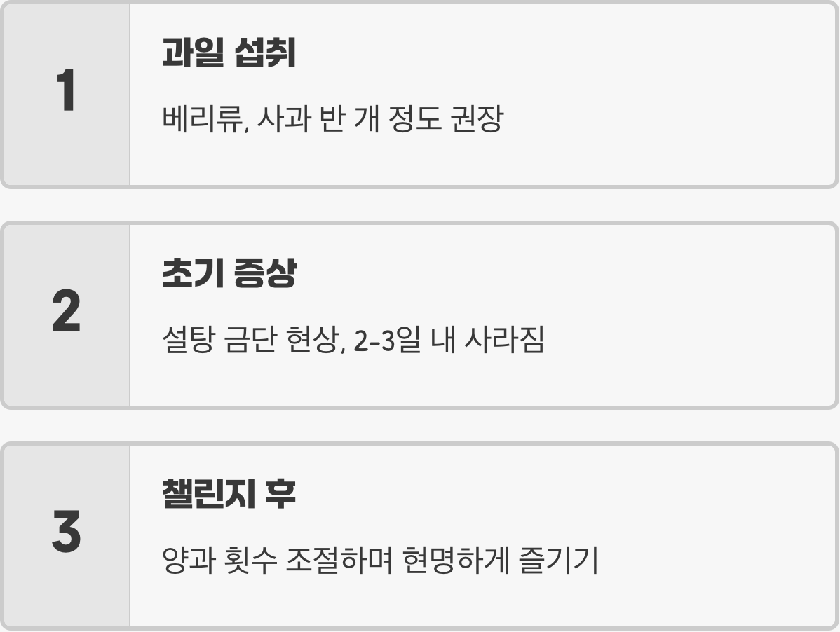 도전의 첫 3일은 우리 몸에서 과도한 당분을 비워내는 가장 중요한 시기입니다. 이 기간에는 흰쌀, 밀가루 음식(빵, 면), 설탕이 들어간 모든 음료와 간식과 과감히 작별 인사를 고하세요. 처음에는 약간의 두통이나 무기력감을 느낄 수 있지만, 이는 몸이 정상으로 돌아가고 있다는 긍정적인 신호입니다.
