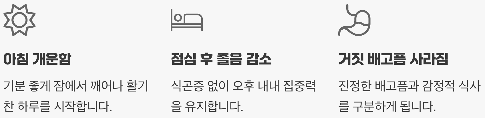 챌린지 후반부에 접어들면, 여러분은 스스로의 변화에 놀라게 될 것입니다. 아침에 눈을 뜨는 것이 한결 개운해지고, 점심 식사 후 몰려오던 극심한 졸음이 사라집니다. 불필요한 수분과 부기가 빠져나가 몸이 가벼워지고, 무엇보다 시도 때도 없이 음식을 찾던 거짓 배고픔이 눈에 띄게 줄어든 것을 체감할 수 있습니다.