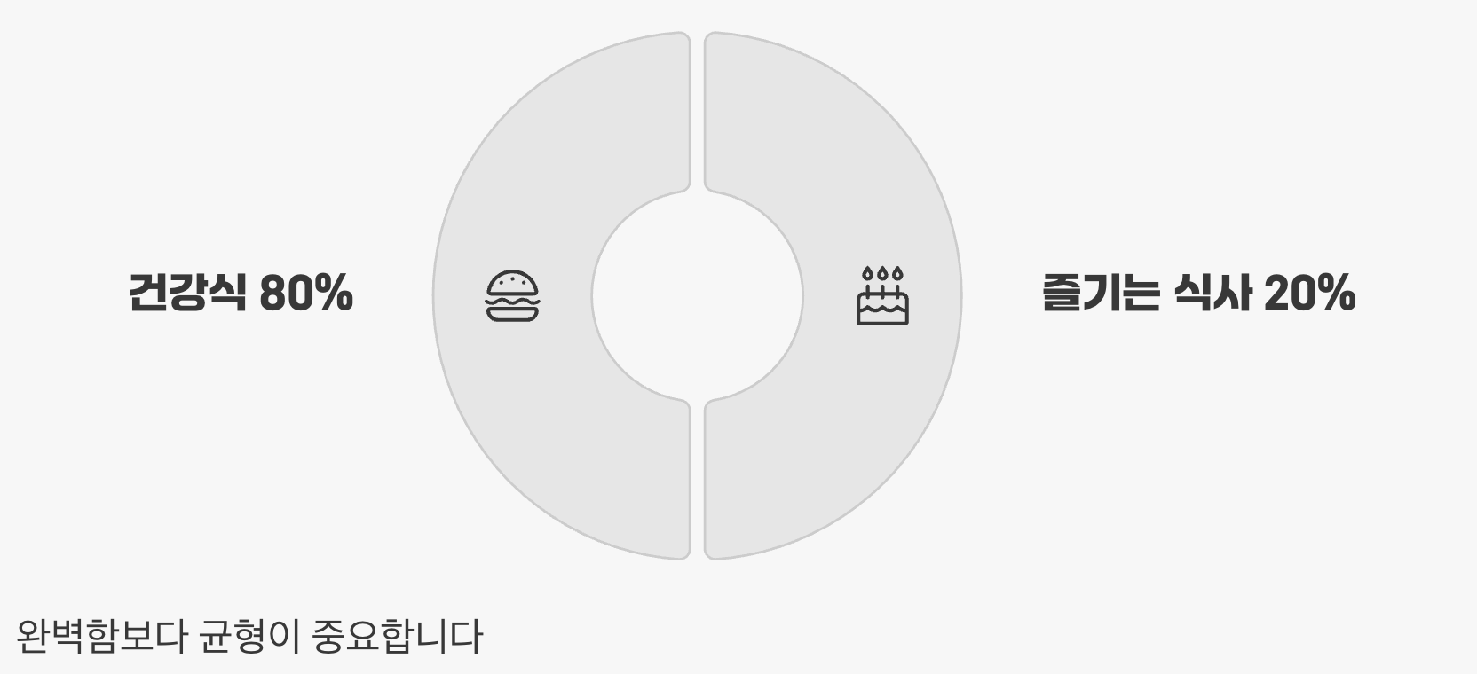 평소 식단의 80%는 챌린지 기간처럼 건강한 단백질, 채소, 좋은 탄수화물로 구성하고, 나머지 20%는 먹고 싶은 음식을 즐기는 유연성을 가지세요. 이러한 균형 잡힌 접근 방식은 스트레스 없이 오랫동안 건강한 삶을 유지하는 가장 현명한 방법입니다.