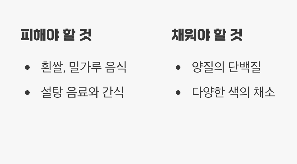 그 빈자리는 몸에 이로운 영양소로 가득 채워주어야 합니다. 매 끼니에 닭가슴살, 두부, 계란, 등푸른생선과 같은 양질의 단백질과 시금치, 브로콜리, 파프리카 등 색색의 채소를 듬뿍 섭취하세요. 포만감을 오래 유지해주어 힘든 초기 단계를 훨씬 수월하게 보낼 수 있도록 도와줍니다.