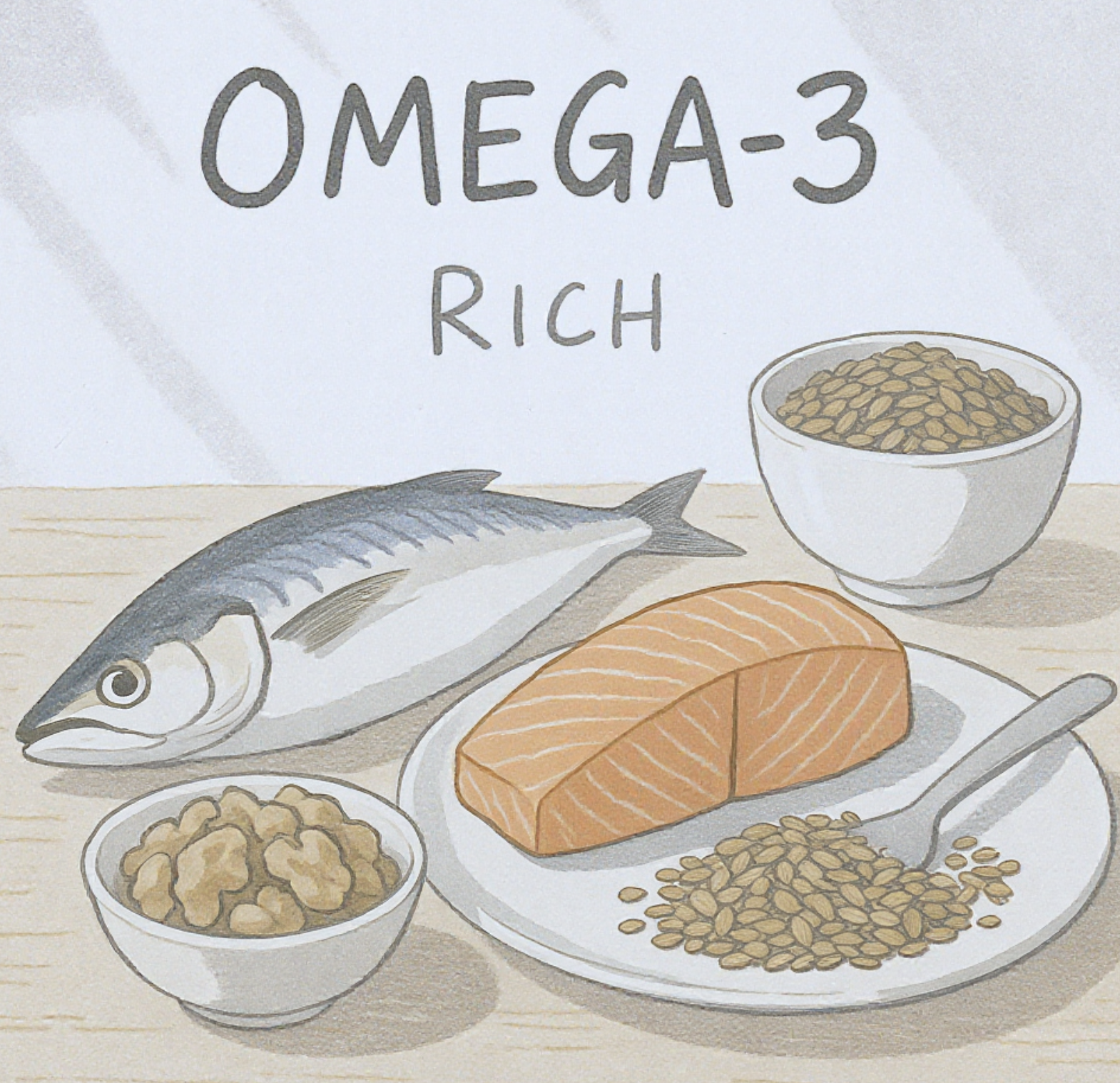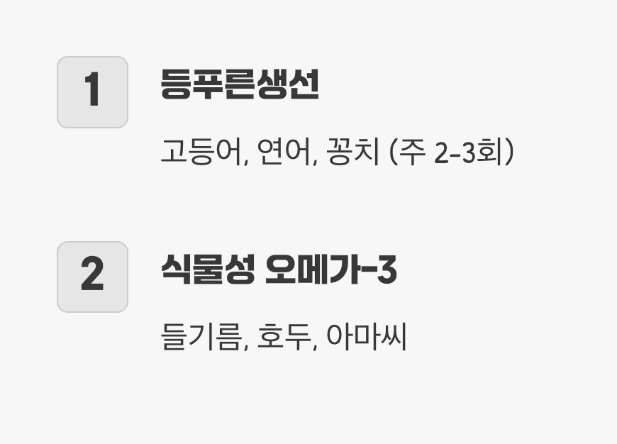 오메가-3를 가장 풍부하게 섭취할 수 있는 최고의 식품은 바로 고등어, 연어, 꽁치 같은 등푸른생선입니다. 일주일에 2~3회 정도 식탁에 생선을 올리는 습관을 들여보세요. 생선을 싫어한다면, 들기름을 나물 무침에 활용하거나 호두, 아마씨 같은 견과류를 간식으로 챙겨 먹는 것도 오메가-3를 보충할 수 있는 훌륭한 방법입니다.
