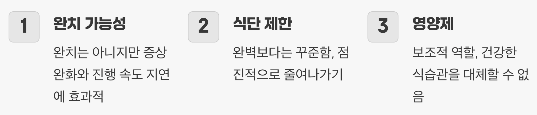 A. 아니요, 항염 식단은 이미 닳아버린 연골을 재생시키거나 관절염을 완치하는 치료법은 아닙니다. 하지만 염증을 조절하여 통증, 붓기, 뻣뻣함 같은 불편한 증상을 크게 완화시키고, 질병의 진행 속도를 늦추는 데 매우 효과적인 ‘관리 방법’입니다.
